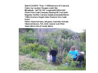 Today you are going to learn the site survey of Douglas creek at site #6. The stream reach begins at N 47.29.435 W119.54.047. The stream reach ending is N47.29.436 W119.54.022.